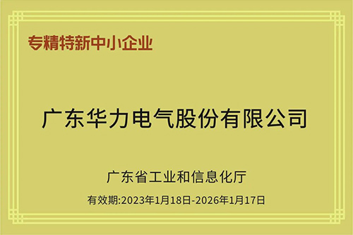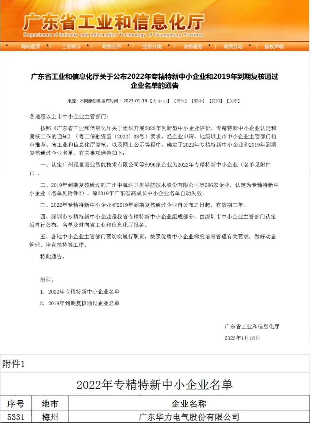 近日,省工信廳公布《2022年“專精特新”中小企業和2019年到期復核通過企業名單公示》。廣東華力電氣股份有限公司成功獲評“2022年度廣東省專精特新中小企業”。